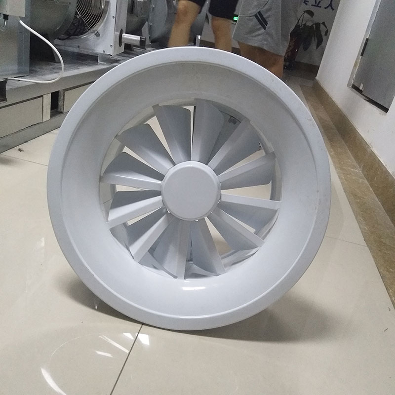 旋流风口旋流风口是空调系统中的一个排风工具。在空调通风系统中可用作大风量,大温差送风以减少风口数量,安装在天花板或顶棚上,可用于3米以内低空间,也可用二种高度大面积送风,高度甚至可达10米以上。 旋流风口送出旋转射流,具有诱导比大,风速衰减快的特点。